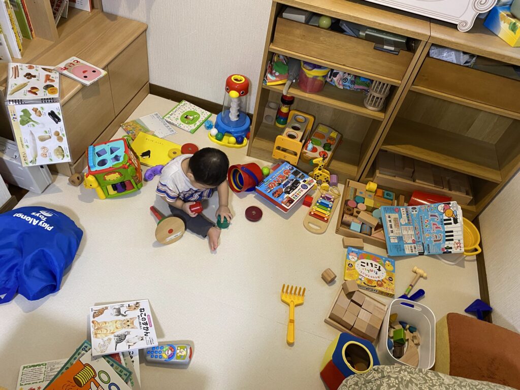 (床いっぱいに広がったおもちゃと絵本…カオスです笑)