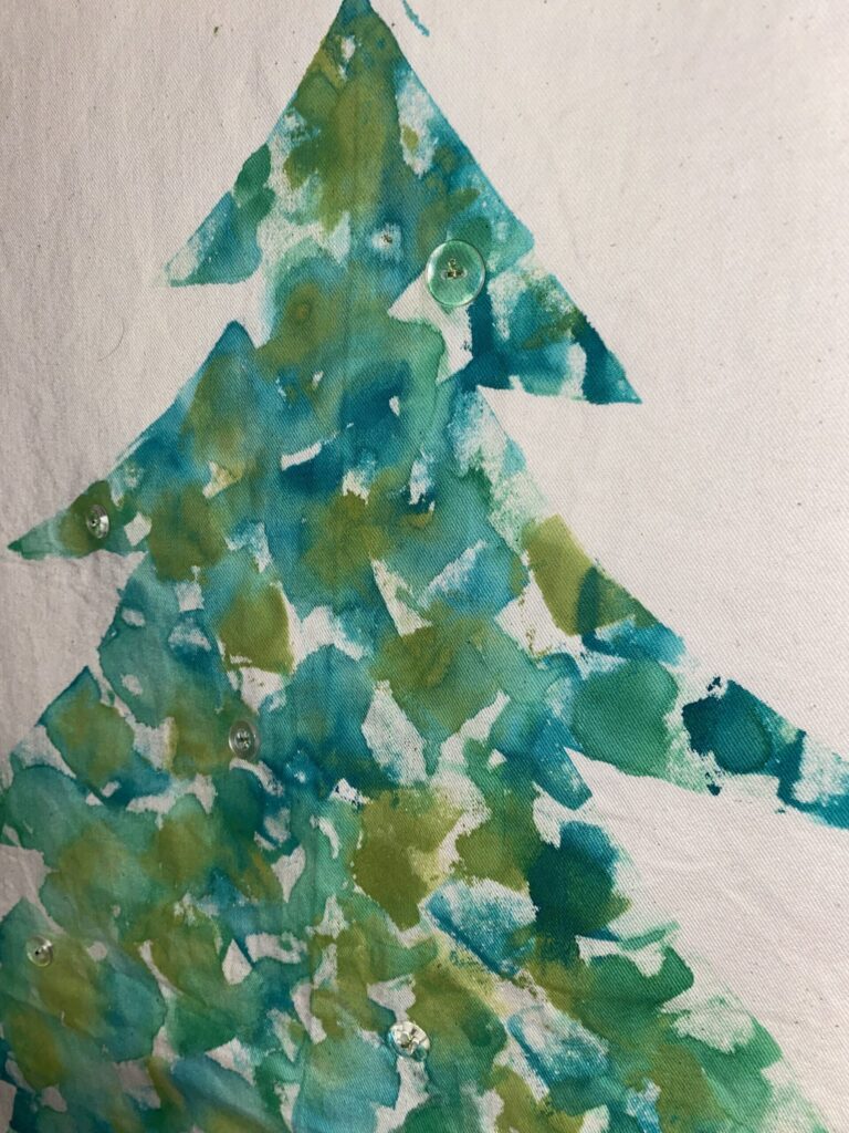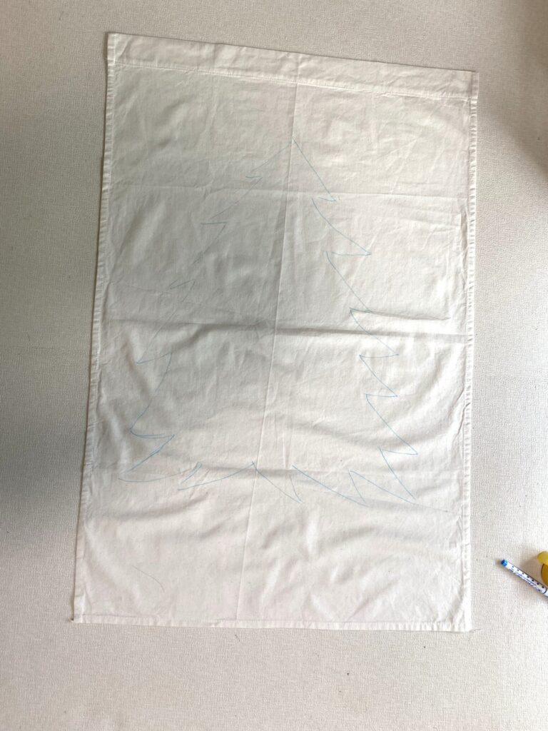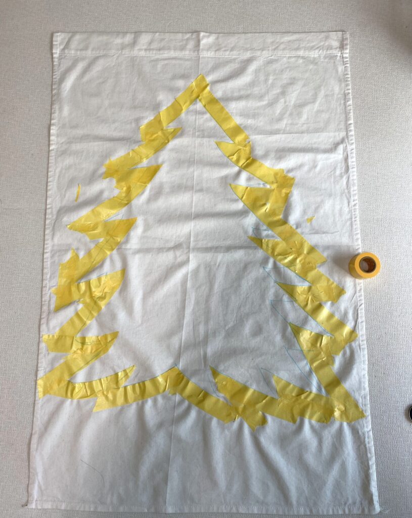 布にチャコペンでクリスマスツリーの下絵を描き、ラインに沿ってマスキングテープでふちどりします。テープ部分には絵具が乗らないので、テープの内側だけ色を塗るイメージです。