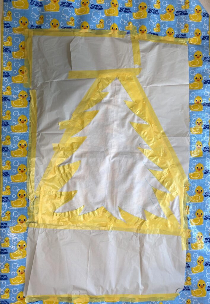 マスキングテープでツリーの形を描いたら、飛び散り防止でその周りの布を不要な紙で覆い、土台布ごとレジャーシートに固定しました。