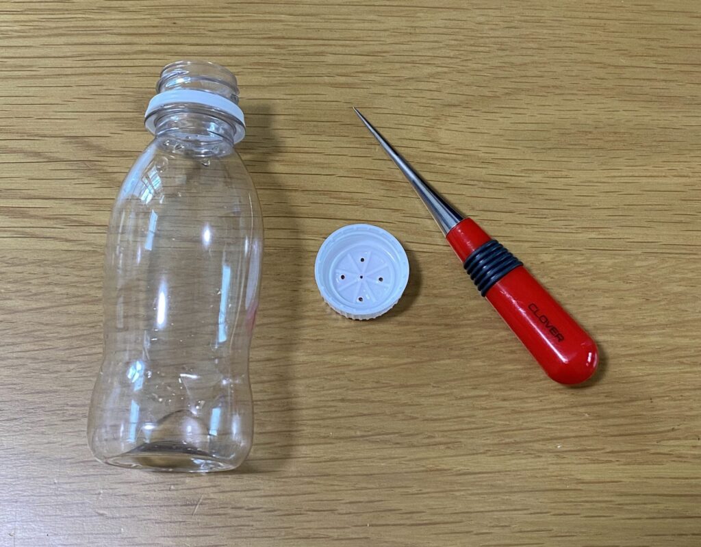 初めに、目打ちなどでふたに穴をあけます。ここから絵具が出てきます。私は5つ穴をあけましたが、穴の数や大きさを変えれば絵具の出る量を調整できそうです。