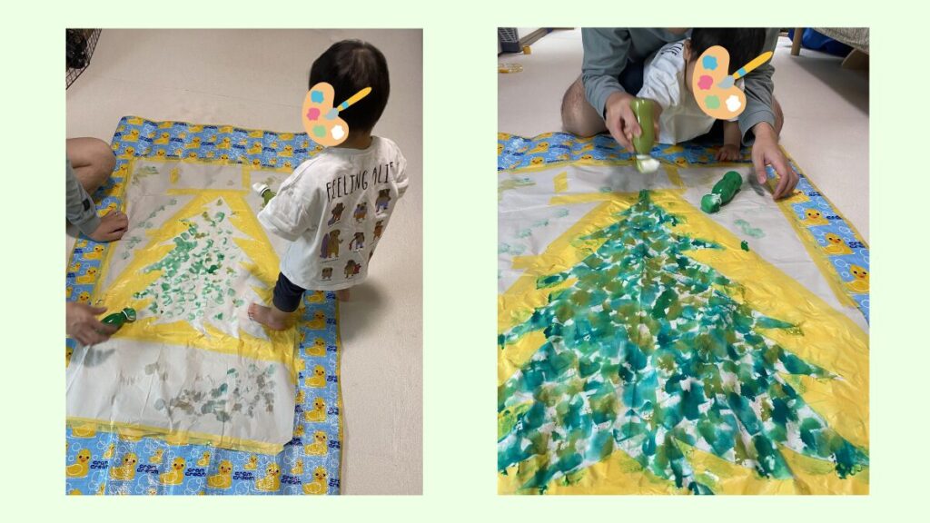 1歳の息子も楽しそうにポンポン!色塗りに参加してくれました。