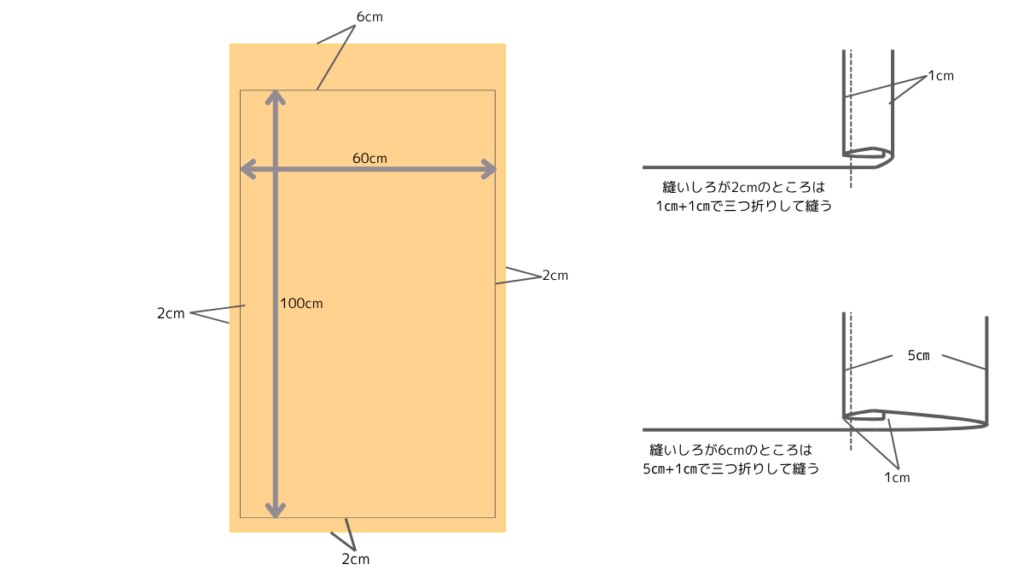 完成サイズは「たて100cm × よこ60cm」。上辺だけは縫い代を6cmとって太めに折り、壁掛け用のポールを通せるようにしました。その他の辺は縫いしろを2cmつけて、3つ折りにしてミシンをかけました。