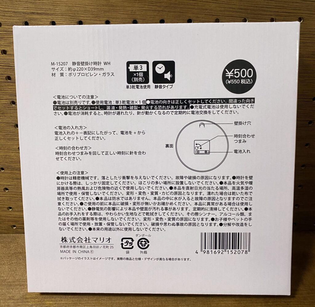 100均で購入した500円の時計(連続秒針タイプ)