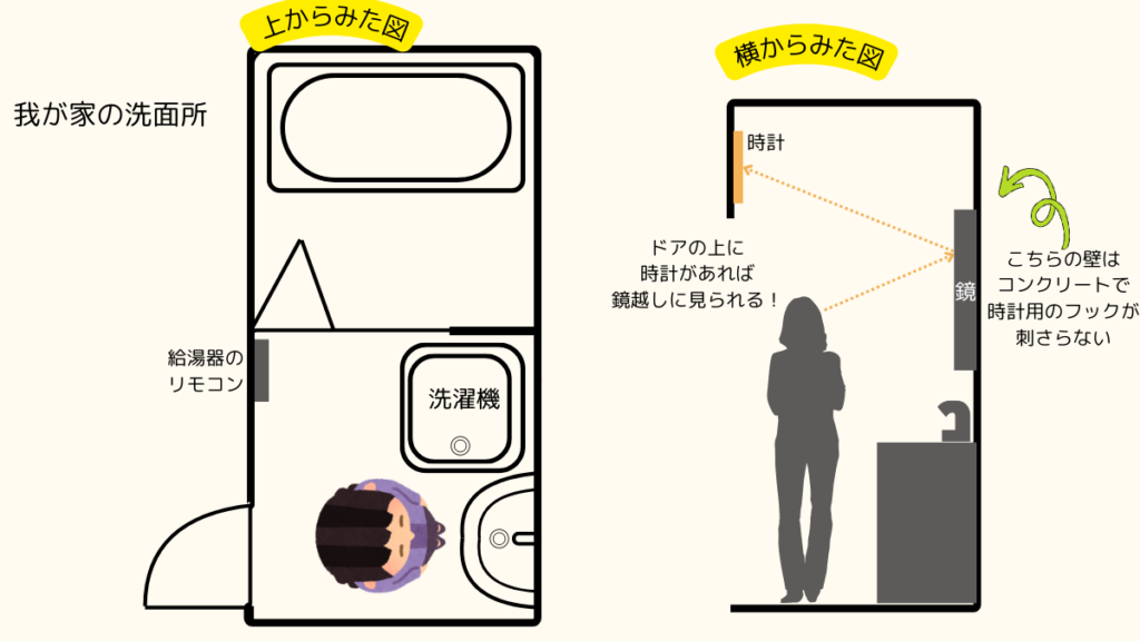 でも、我が家の洗面所をイラストにしたのがこんな感じで👇時計を置く余裕のある広さではないんです(笑)