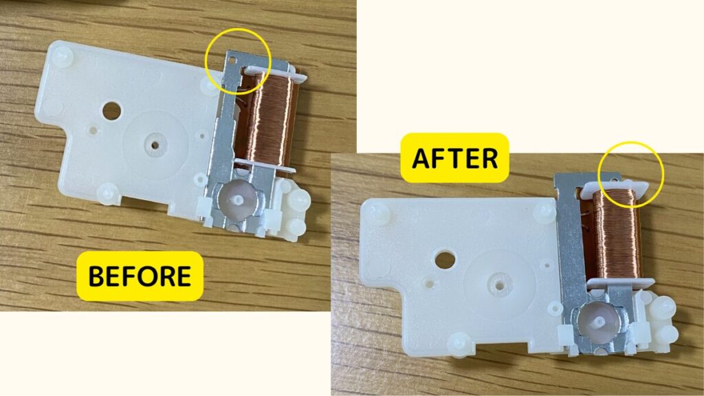 写真の丸で囲んだ部分の穴の位置が、BEFORE⇒AFTERで違うのが分かりますか?