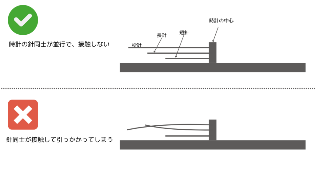 おかしいなと思ってよく見ると、なんと秒針が歪んで長針に引っかかっていました。図にするとこんな感じ。手で針を引っこ抜くときに針が若干曲がってしまったようです。