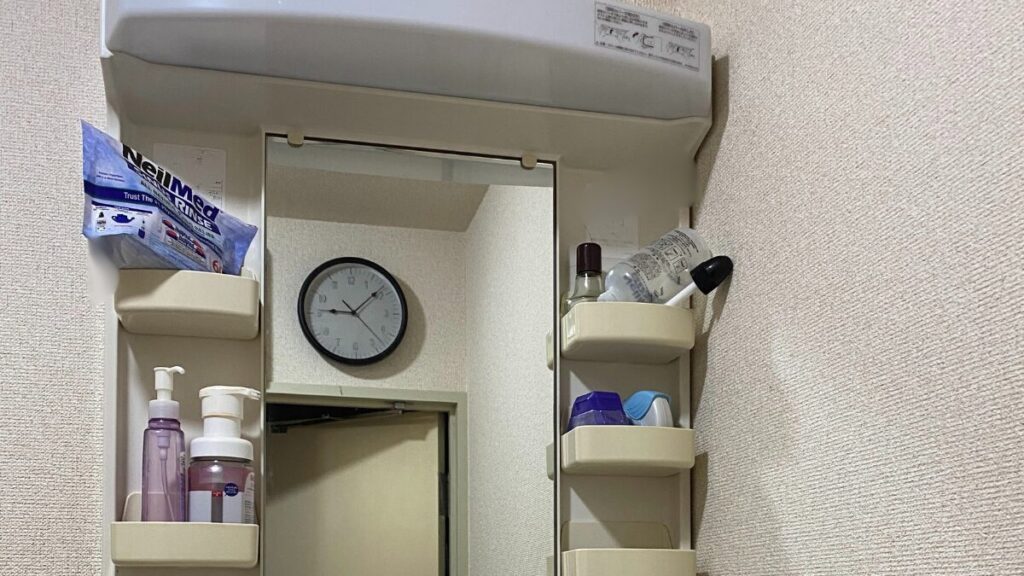 じゃあ 鏡の上に時計を取り付ける? とも思ったのですが、洗面台のある壁はコンクリートで、フックを固定できず断念。