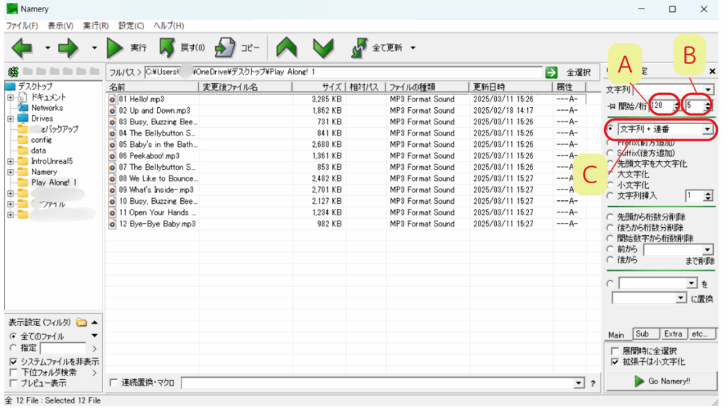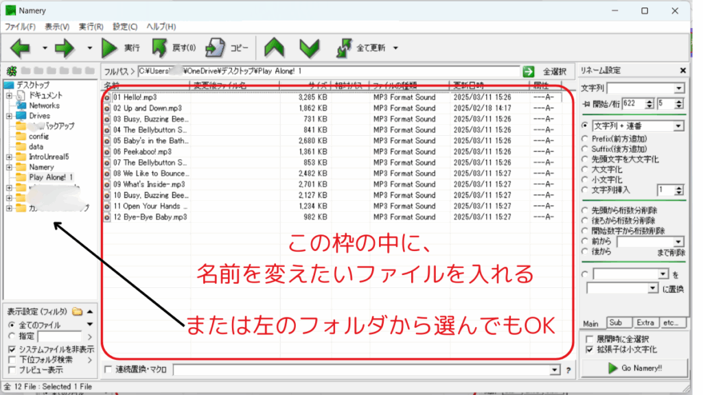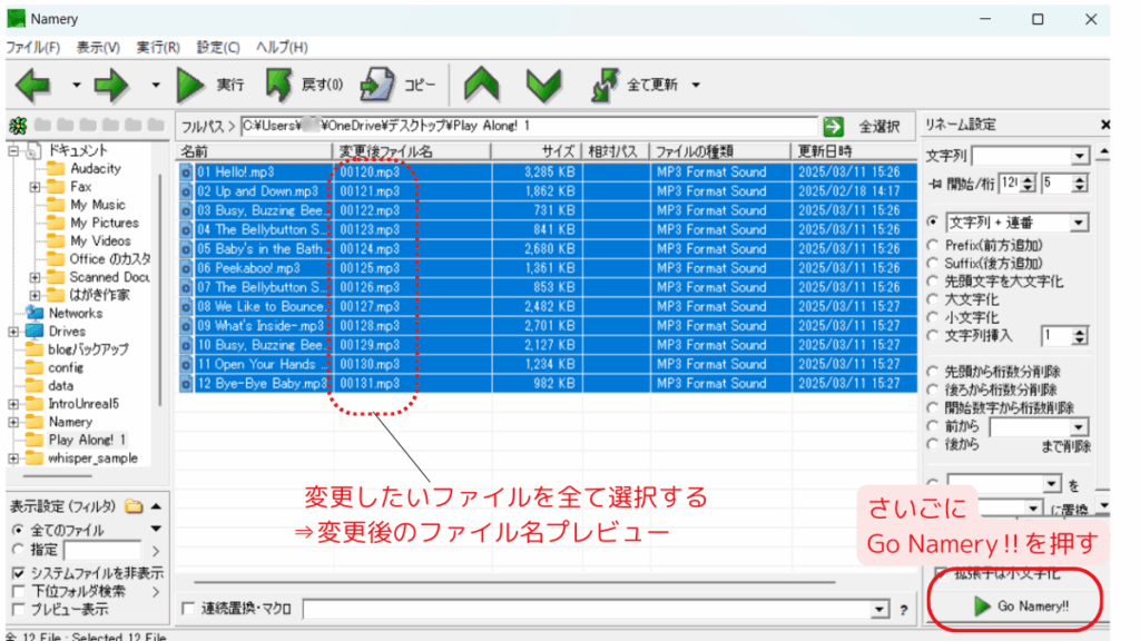 たとえば、上の画面を例に、12個のファイルの名前を変える場合。