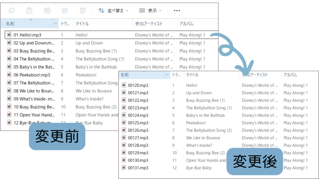 今回は1曲目の「Hello!」を00120.mp3、その後連番で00121.mp3、00122.mp3…と名前を付けていくことにします。