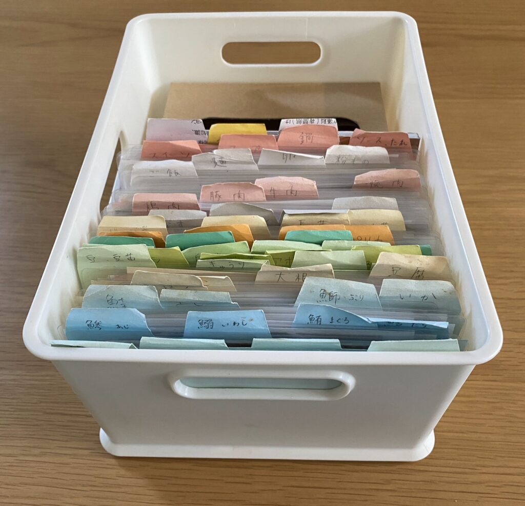 我が家では、メイン食材ごとにカードを仕分けして、ニトリのNインボックスに収納しています。